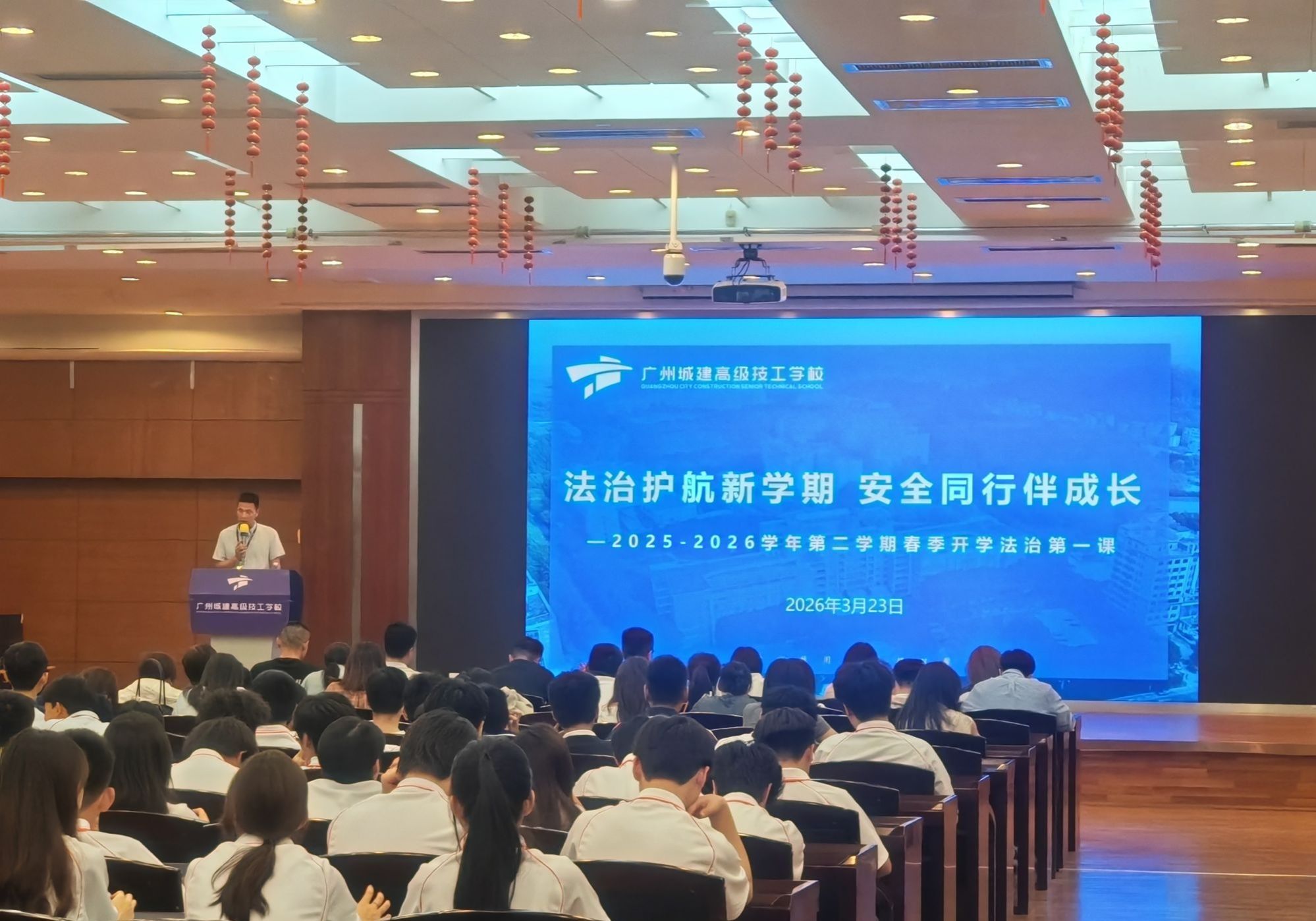 为进一步增强青少年法治观念,筑牢校园安全防线,营造文明、平安、和谐的育人环境,3月23日晚,我校在人文艺术楼四楼报告厅隆重开展“法治护航新学期 安全同行伴成长”——2025-2026学年第二学期春季开学法治第一课活动。活动特别邀请我校法治副校长、江埔派出所二级警长江梓维担任主讲,为全体班主任、24级及25级学生代表、26级春季班学生带来一堂干货满满、贴合青少年成长需求的法治安全专题讲座。