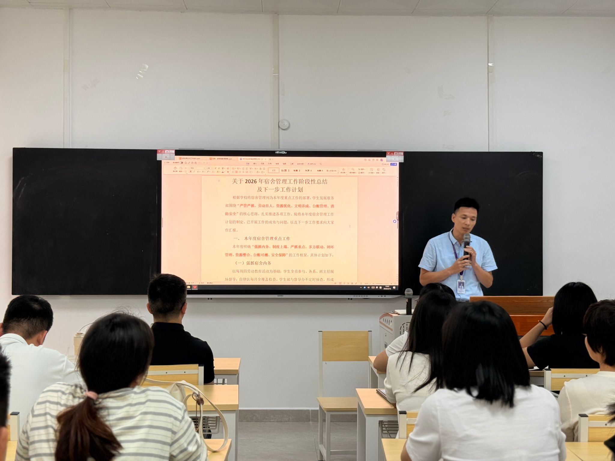 会议伊始,张贵平副主任就宿舍管理工作作专题发言。他结合近期宿舍检查情况,通报了当前宿舍内务卫生、安全纪律等方面存在的问题,强调宿舍是学生在校生活的重要阵地,要求各班主任高度重视宿舍管理工作,加强日常巡查与监督,引导学生养成良好的生活习惯,营造安全、整洁、文明的住宿环境,筑牢校园安全防线。